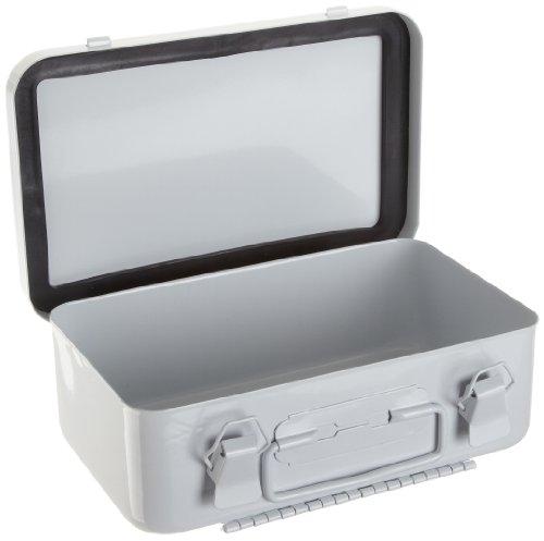 10 Unit Metal First Aid Kit Box. Durable drawn metal cover and body. Cover is welded to body using a full piano hinge with a rust resistant hinge pin. Holds 10 standard prepackaged first aid units. Meets rigid government specifications. Cover opens 90 degrees for use as a shelf. One piece cover gasket is included and keeps moisture out. 2 Positive pull-down catch. Convenient carrying handle. Wall mounting hangers with keyhole slots. Interior is open; no partition. Sold without contents. Finished with a durable white powder coat finish. Measures 7-1/2" width by 4-1/2" height by 2-3/8" depth.