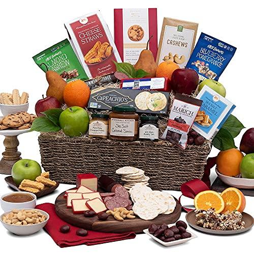 - This generous gift is perfect as a gift basket for families, for men, women, birthdays, holidays, thank you, sympathy, and corporate. Inside a beautiful woven basket, they will discover an impressive arrangement of freshly harvested orchard fruits that are nestled among coveted gourmet foods. Guaranteed gourmet goodness only from GourmetGiftBaskets.com, from our family to yours!